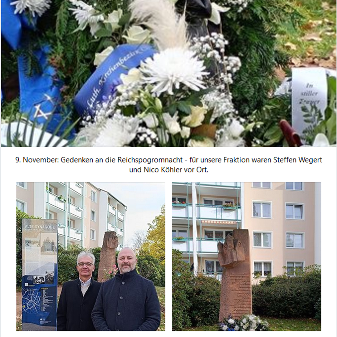 Am heutigen 9. November 2023, dem 85. Gedenktag an die Reichspogromnacht 1938, nahmen für unsere AfD-Stadtratsfraktion Steffen Wegert und Nico Köhler am Stephanplatz teil.