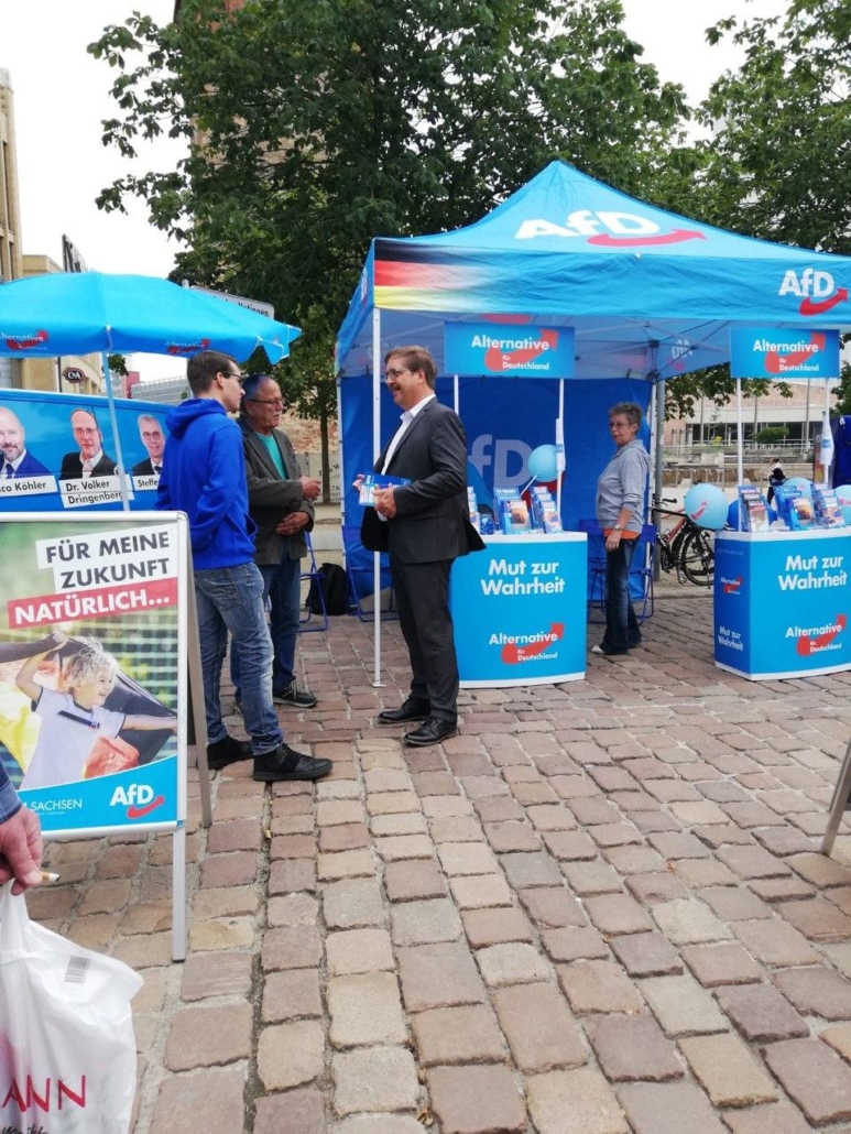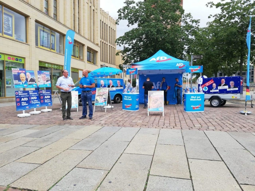 Der Johannisplatz war „blau“, von 10 – 16 Uhr haben mit ca. 20 Standbetreuern, 2 Infomobilen und Pavillons sowie vielen weiteren AfD-Werbemitteln für großes Aufsehen gesorgt, unser Infomaterial ging weg wie die sprichwörtlich „warmen Semmeln“.