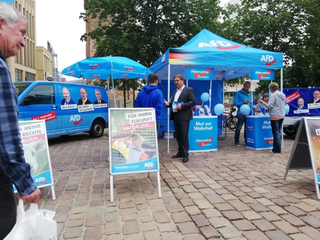 Am Freitag reisten nochmals Tobias Peterka und viele AfD Mitglieder aus Bayern an und halfen entweder beim Plakatieren oder beim Aufbau der Infostände in der Innenstadt und z.B. an der Sachsenalle, im Chemnitz Center und ACC.