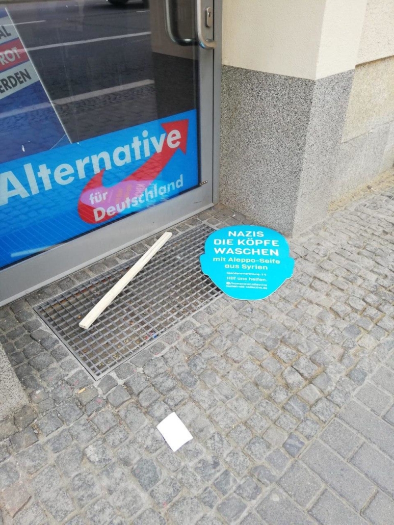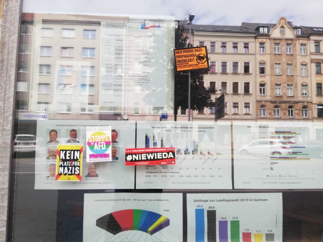 Erneut wurde unser Büro Opfer eines demokratiefeindlichen Angriffs von Anhängern diverser linker Organisationen, wie z.B. Aufstehen gegen Rassismus. Diese Leute interessieren sich nicht für die Wahlergebnisse und die Stimmen, die die Chemnitzer Bürger abgegeben haben. Sie sehen in uns Nazis, die mit allen Mitteln zum Schweigen gebracht und zerschlagen werden müssen, egal wie groß die Zustimmung in der Bevölkerung ist. Diejenigen, die uns wählen, sind eben auch alles Nazis. 17,9% Nazideutschland!