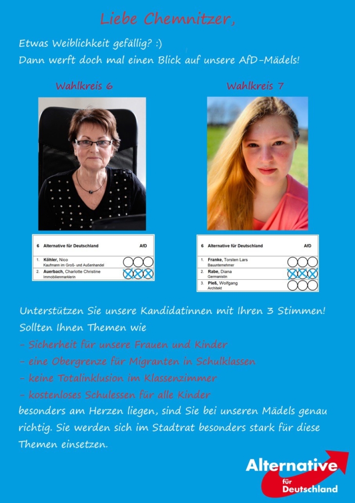 Alle Wähler, die die Entwicklung von Chemnitz im Fokus haben, aber auch über die Grenzen unserer Stadt hinausblicken, die sichere Städte und Gemeinden, zukunftsfähige Arbeitsplätze in einem lebenswerten Sachsen, konsequente Kriminalitätsbekämpfung, mehr direkte Demokratie und die Wahrung unserer Werte und Traditionen als wichtig erachten, möchten wir sehr herzlich um ihre Stimme bitten!